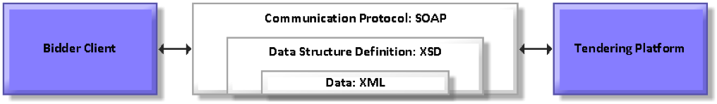Technically, the Bidder Interface is specified as a SOAP web service (see Figure 3). SOAP defines the protocol of the message exchange between bidder client and tendering platform. To define the structure of the exchanged messages, XSD (XML Schema Definition) is used. The exchanged messages themselves are represented in XML that meets the requirements of the XSD schema.