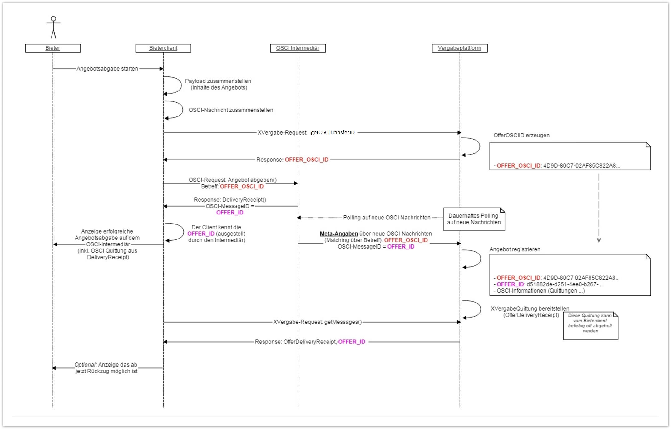 OfferDeliveryReceipt | Plattform | Bieteranwendung | 0 | Angebotseingangsquittung, die die Plattform im Rahmen einer sendSynchronousMessage-Transaktion, die ein Offer enthält, ausstellt bzw. im OSCI-Transport-Fall bei Feststellung des entsprechenden Nachrichteneingangs (siehe Kapitel „Abgabe von Angeboten, TNAs und Rückzügen via OSCI-Transport"). Referenziert die Nachrichten-ID der Offer-Nachricht des Clients, die Angebots-ID unter der die Plattform das Angebot verarbeitet hat (und mit der ggf. ein Rückzug durch den Bieter veranlasst werden kann), enthält den Zeitpunkt des Nachrichteneingangs (KEIN kryptographischer Zeitstempel) und einen Indikator, ob das Angebot fristgerecht (vor Ablauf der Angebotsfrist) eingegangen ist. MUSS ebenso eine plattform-spezifische Angebotseingangsquittung in einem Menschen-lesbaren Format (HTML, PDF) enthalten/referenzieren, die sich die Bieteranwendung mittels getDocument-Operation von der Plattform abrufen SOLL, um sie dem Bieter anzuzeigen. KANN eine plattform-spezifische technische Angebotseingangsquittung enthalten/referenzieren (bspw. im XML-Format), die sich die Bieteranwendung mittels getDocument-Operation von der Plattform abrufen kann. Nachricht wird der Bieteranwendung von der Plattform zum Abruf mittels getMessages bereitgestellt. Wird also in einer getMessages-Response transportiert. Zusätzlich (im Falle der Angebotsabgabe via XVergabe-sendSynchronousMessae-Operation) AUCH in der sendSynchronousMessage-Response. Die beiden Quittung MÜSSEN inhaltlich identisch sein. |