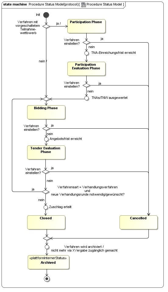 Ein Vergabeverfahren durchläuft unterschiedliche Phasen, die eine Plattform über die XVergabe-Kommunikationsschnittstelle mitteilen MUSS, da hiervon die weitere Steuerung der möglichen und notwendigen Nachrichtenarten abhängt. Darüber hinaus dient das Status-Modell auch der informatorischen Anzeige ggü. dem Bieter.